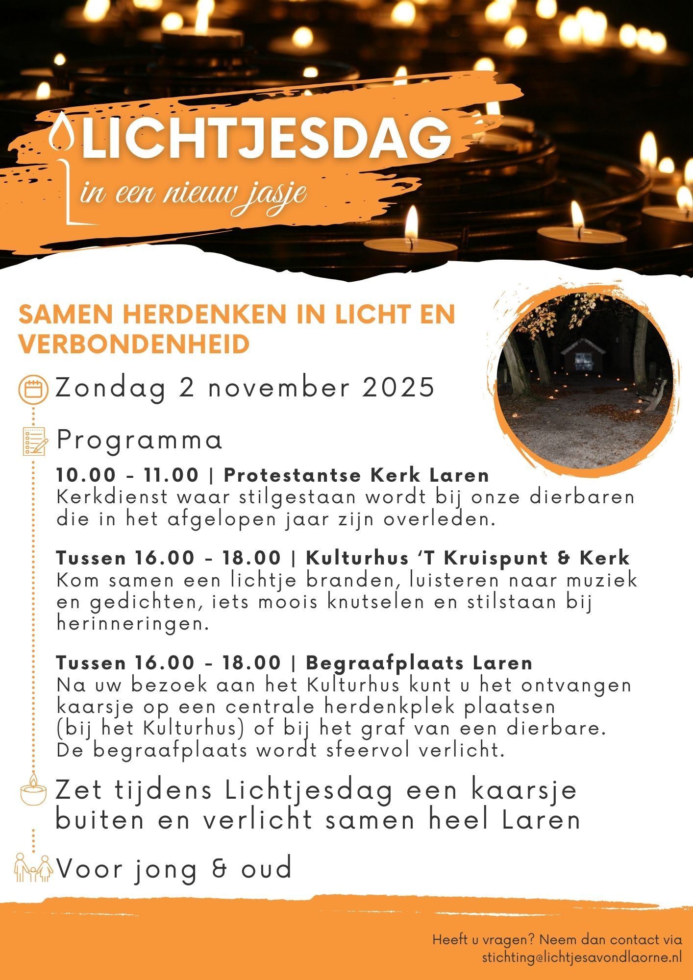 Op zondag 2 november staat Laren in het teken van Lichtjesdag. Een dag waarop we stil mogen staan bij wie we missen en waarop we laten zien dat niemand vergeten is.
